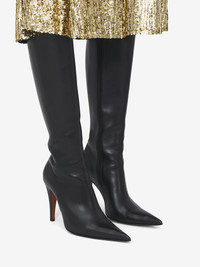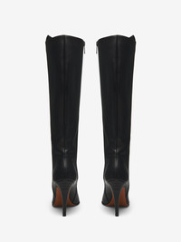 The Birdee Knee-high boot - Razor sharp stiletto boots. Sleek silhouette with a pointed toe. Smooth black calf leather. Finished with an embossed inverted skull heel detail and inside zip closure. Product details - Zip closure - Elongated pointed toe - Embossed inverted skull - Leather sole - Heel height: 105mm - Product code: 813074WHABC1000 - Made in Italy - Material: Calf Leather