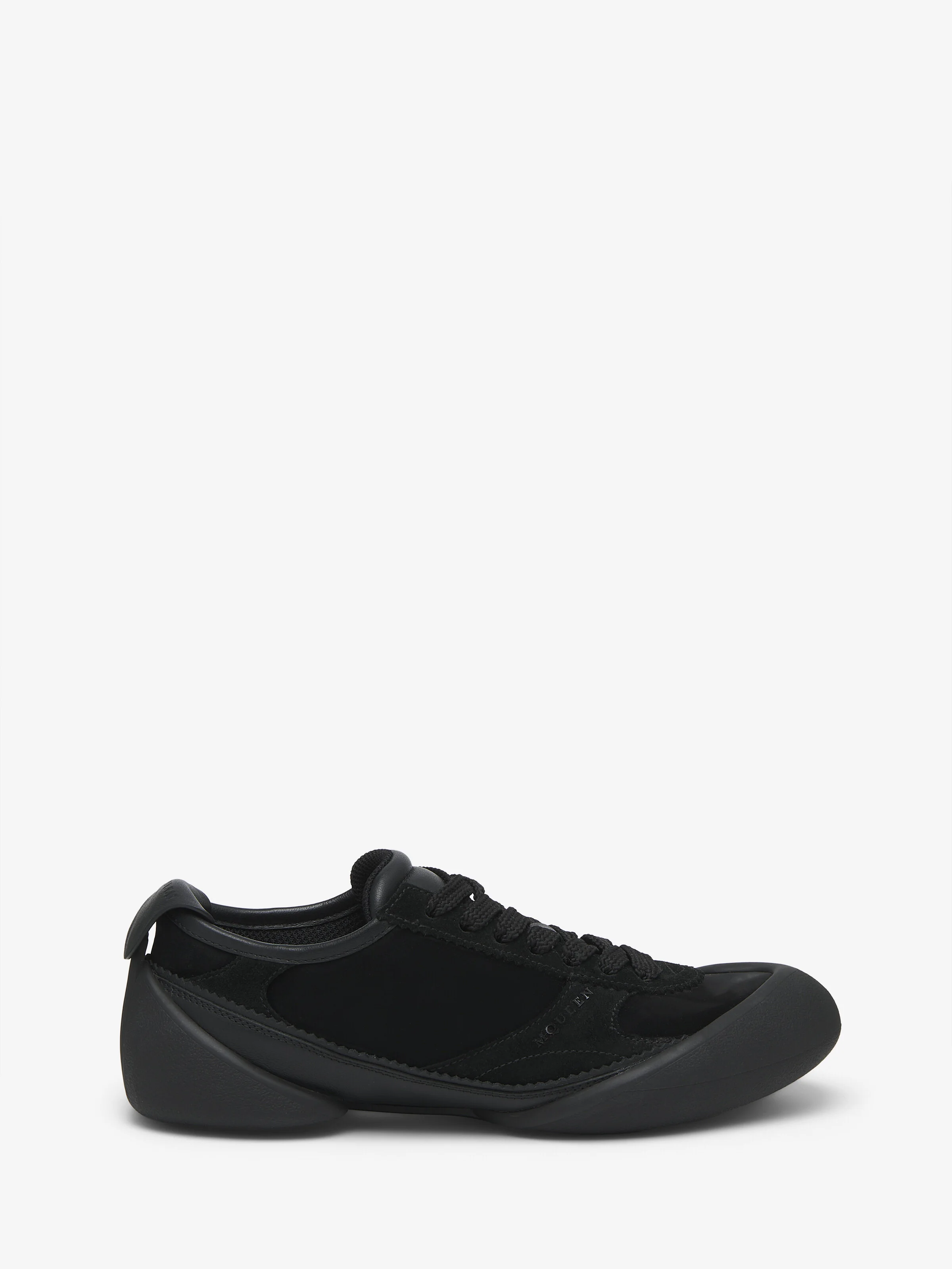 The Flexion sneaker—vintage-inspired silhouette combined with modern innovation. Slim-profile ergonomic design with an anatomical feel. Black nylon, leather and suede with tonal shoelaces and a lightweight split sole. Product details - Lace-up closure - McQueen logo - Round toe - 30 mm lightweight split sole - Product code: 828616W4ABD1002 - Made in ITALY - Material: T1 100% POLYURETHANE