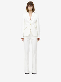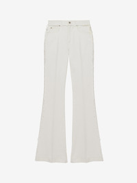 Bootcut jeans in optical white stretch denim. Five pocket design, low waist, tonal topstitching and raw edge detailing. Finished with a front button and zip fastening. Complete the look with the matching jacket. Product details - Low waist - Belt loops - Front button and zip fastening - Product code: 830596QZAON9000 - Made in Italy - Material: 98% Cotton, 2% Elastane