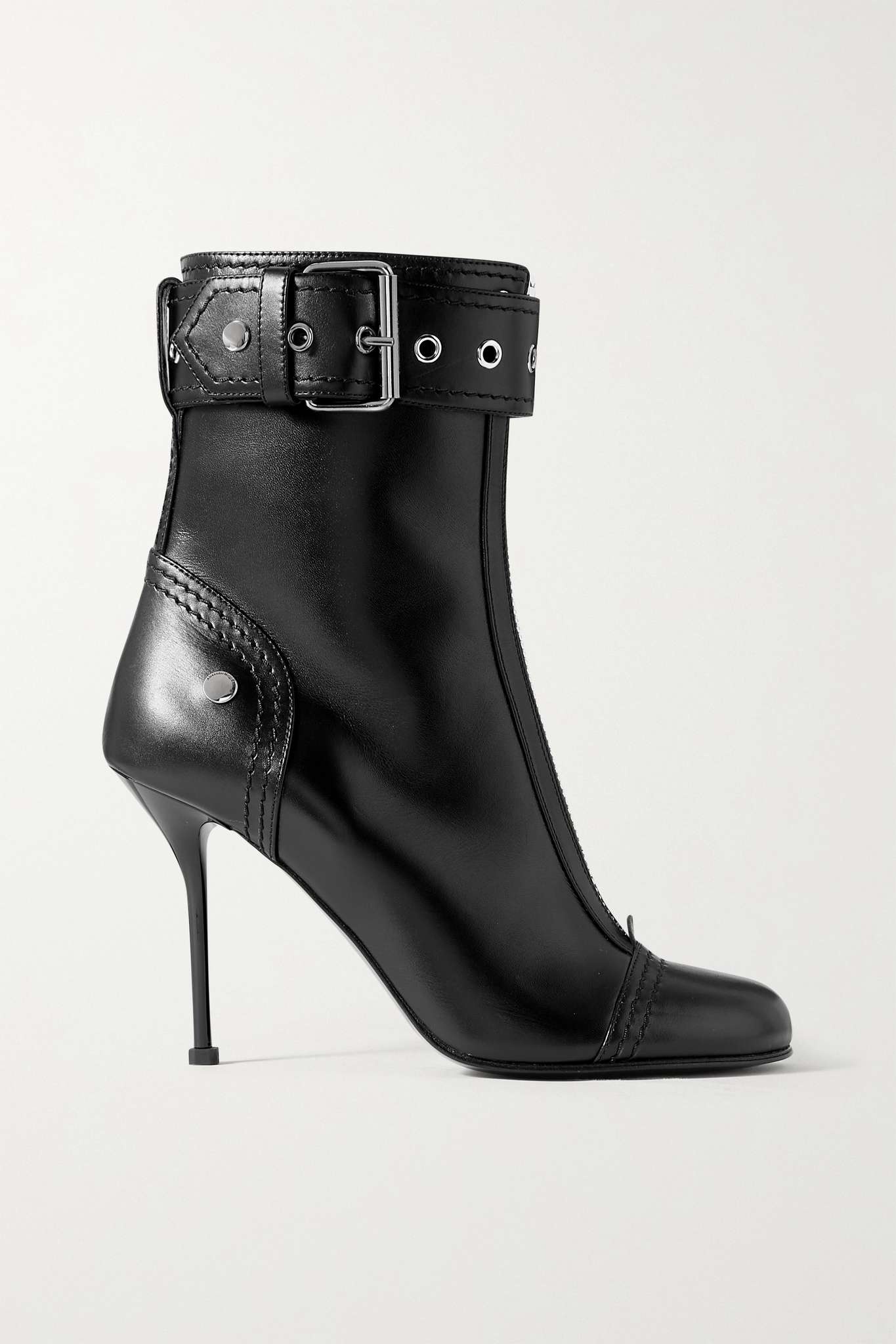 EDITORS'NOTES The chunky buckles on Alexander McQueen's ankle boots are a prize feature of the 'Punk' collection. Crafted from black leather, they feature rounded toes and razor-sharp stiletto heels. SIZE & FIT - Fits true to size, take your normal size - Italian sizing DETAILS & CARE - Heel measures approximately 90mm/ 3.5 inches - Black leather (Calf) - Zip fastening along front, buckle-fastening ankle strap