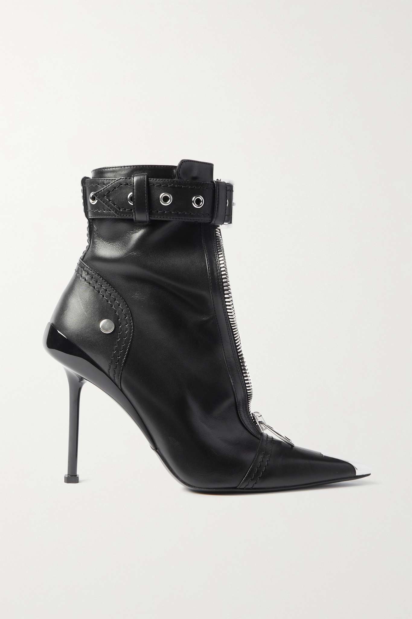 EDITORS'NOTES Alexander McQueen cleverly borrows design elements from biker jackets to create these boots - they're threaded with a belt at the ankle and have dramatic zips meant to be left undone to reveal flashes of skin. Made from leather, they have pin-thin lacquered heels and silver-tone caps at the pointed toes. Wear yours with high hemlines to show off the details. SIZE & FIT - Fits true to size, take your normal size - European sizing DETAILS & CARE - Heel measures approximately 70mm/ 3 inches - Black leather (Calf) - Zip fastening along front, buckle-fastening ankle strap