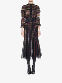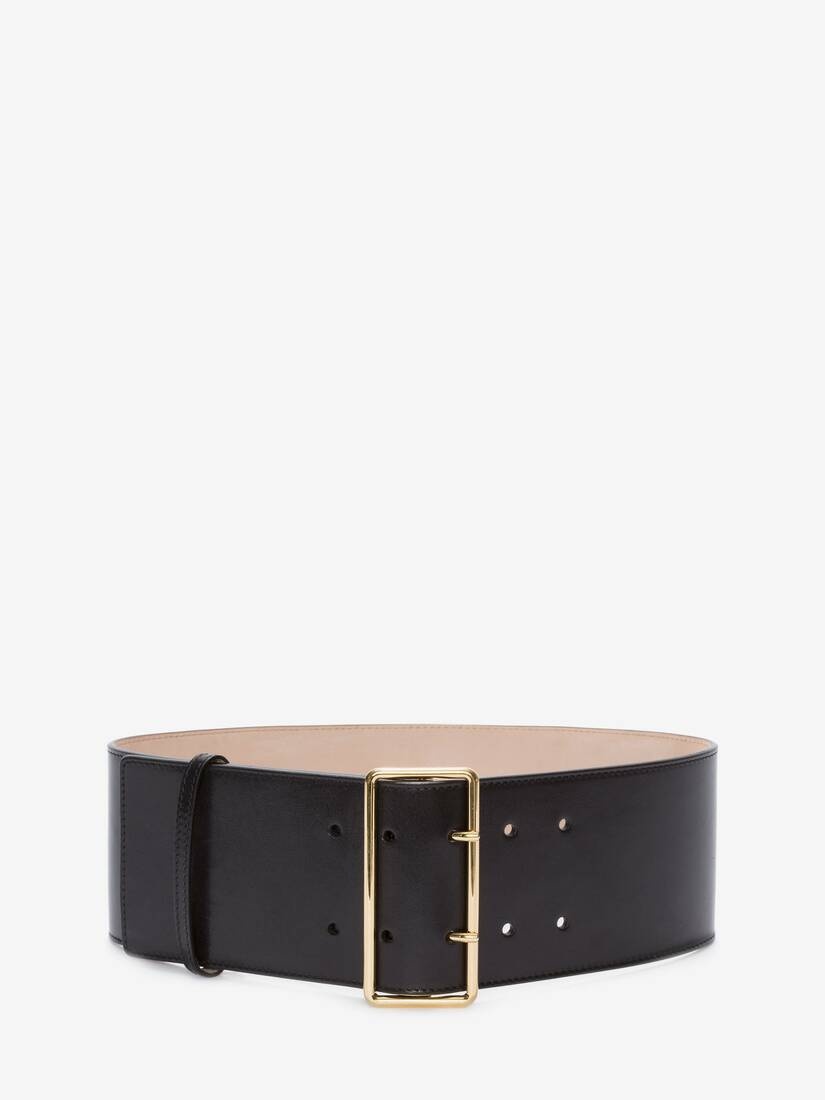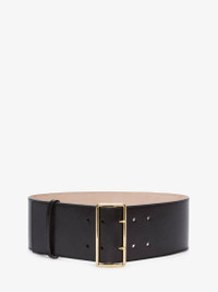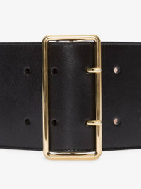 Black calf leather military belt with a large polished gold metal buckle. Features an adjustable buckle with five punched holes. Material:100% Calfskin Product Code:5584521BR0M1000