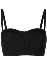 ribbed-knit bra top black fine ribbed bustier-style neckline moulded cup thin shoulder straps sleeveless cropped straight hem Made in Italy Composition Viscose 83%, Polyester 17% SIZE & FIT Model measurements Height 5 ft 11 in(1.8 m) Bust/Chest 28.34 in(72 cm) Hips 35.43 in(90 cm) Waist 23.62 in(60 cm) Washing instructions Dry Clean Only