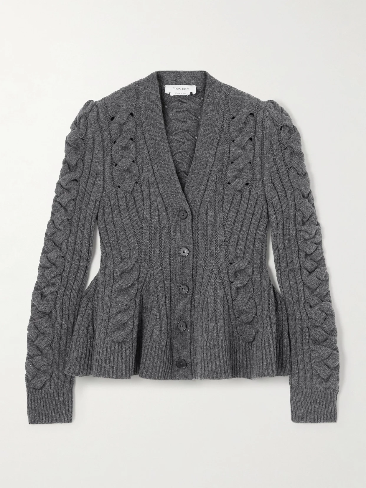Alexander McQueen's cardigan is knitted from a soft wool and cashmere blend with intricate cable stitches. Cut for a slim fit, it's shaped with a flared peplum hem that adds subtle structure to the silhouette.