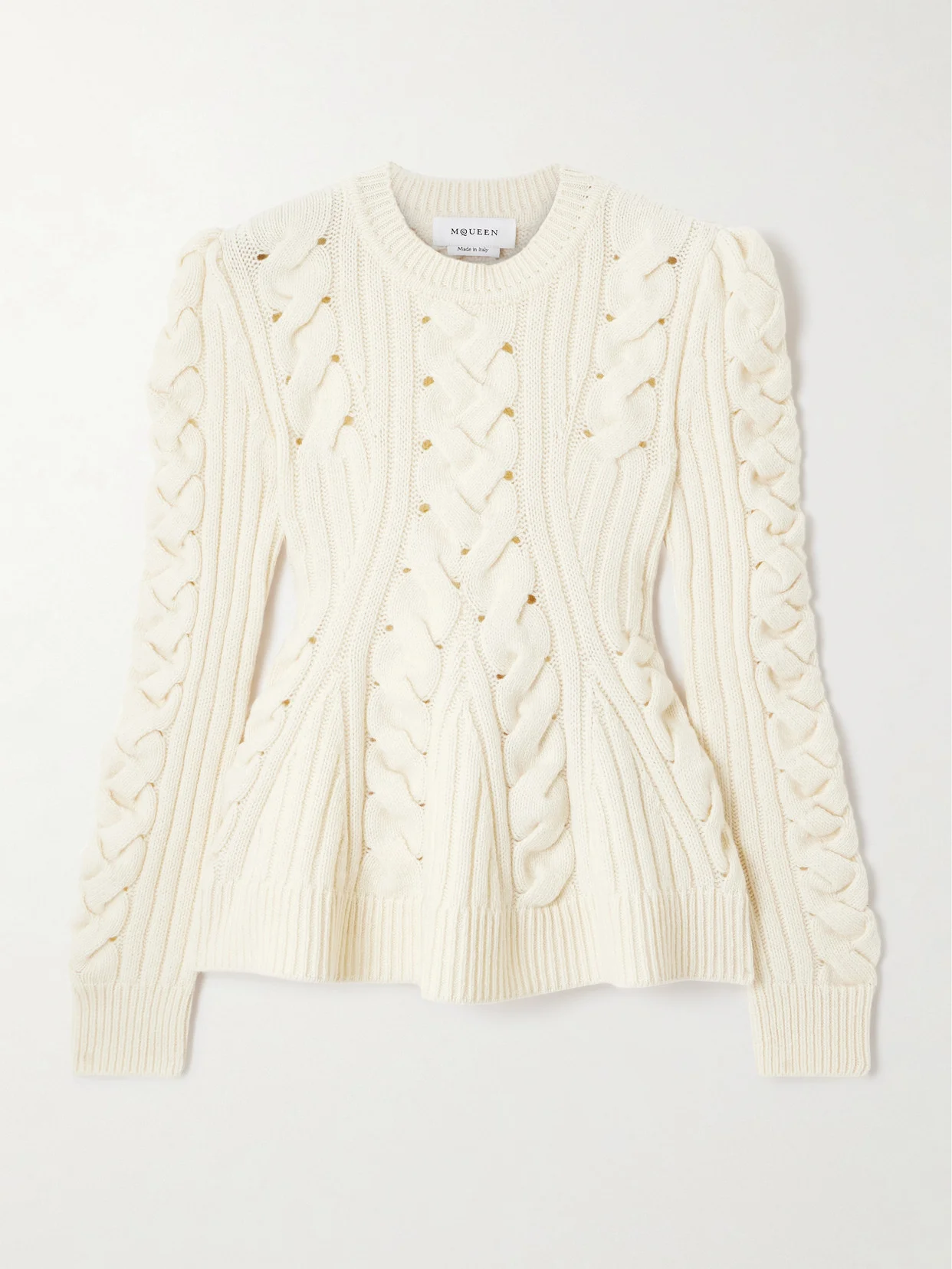 Creative Director Sean McGirr is inspired by the Victorian era for McQueen's Fall '25 collection, and he showcased several looks with jutting hips on the runway. This sweater has been cable-knitted in Italy from wool and cashmere-blend in that same peplum-hem shape. Artfully placed open stitches reveal a glimpse of skin beneath.