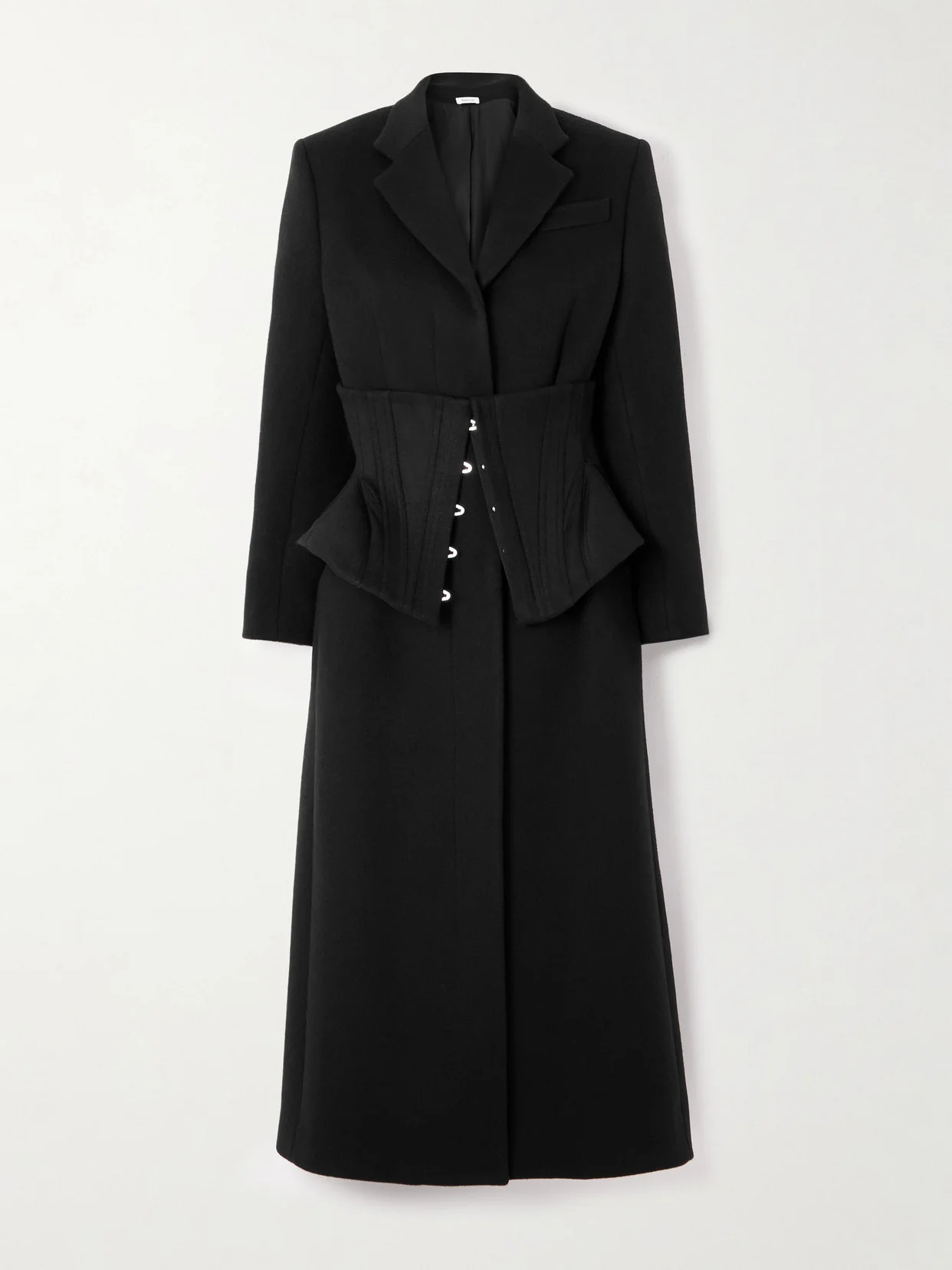 Creative Director Sean McGirr explores neo-dandyism for McQueen's Fall '25 collection, drawing inspiration from Vesta Tilley and Oscar Wilde's work. Worn on the runway, this coat is made from an insulating double-faced cashmere and wool-blend, featuring a single-breasted front and a detachable corset panel that cinches the waist. The signature T-bar chain details the back.