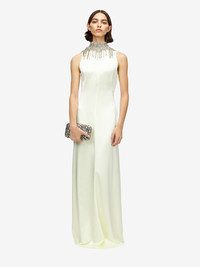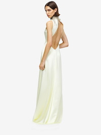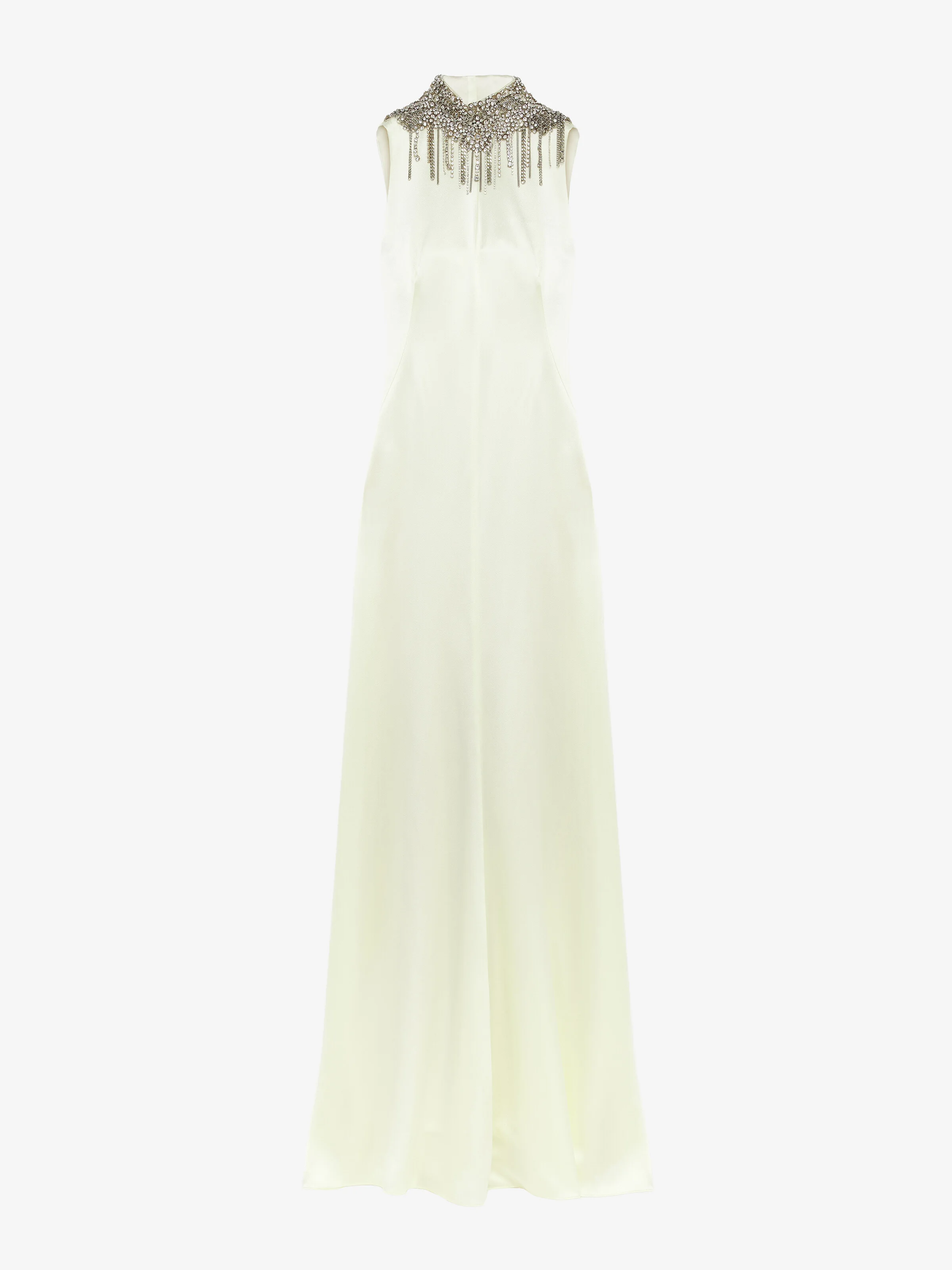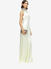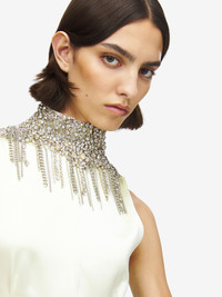 Evening dress in gesso hammered satin. High neck with Chain Mail embroidery made with crystals, bugle beads, metal bullion and dangling details. Finished with an open back with neck button fastening. Product details - Embellished high neck - Back button fastening - Product code: 854343QEAHL9311 - Made in ITALY - Material: 51% Acetate, 49% Viscose
