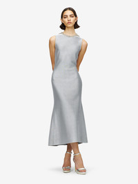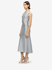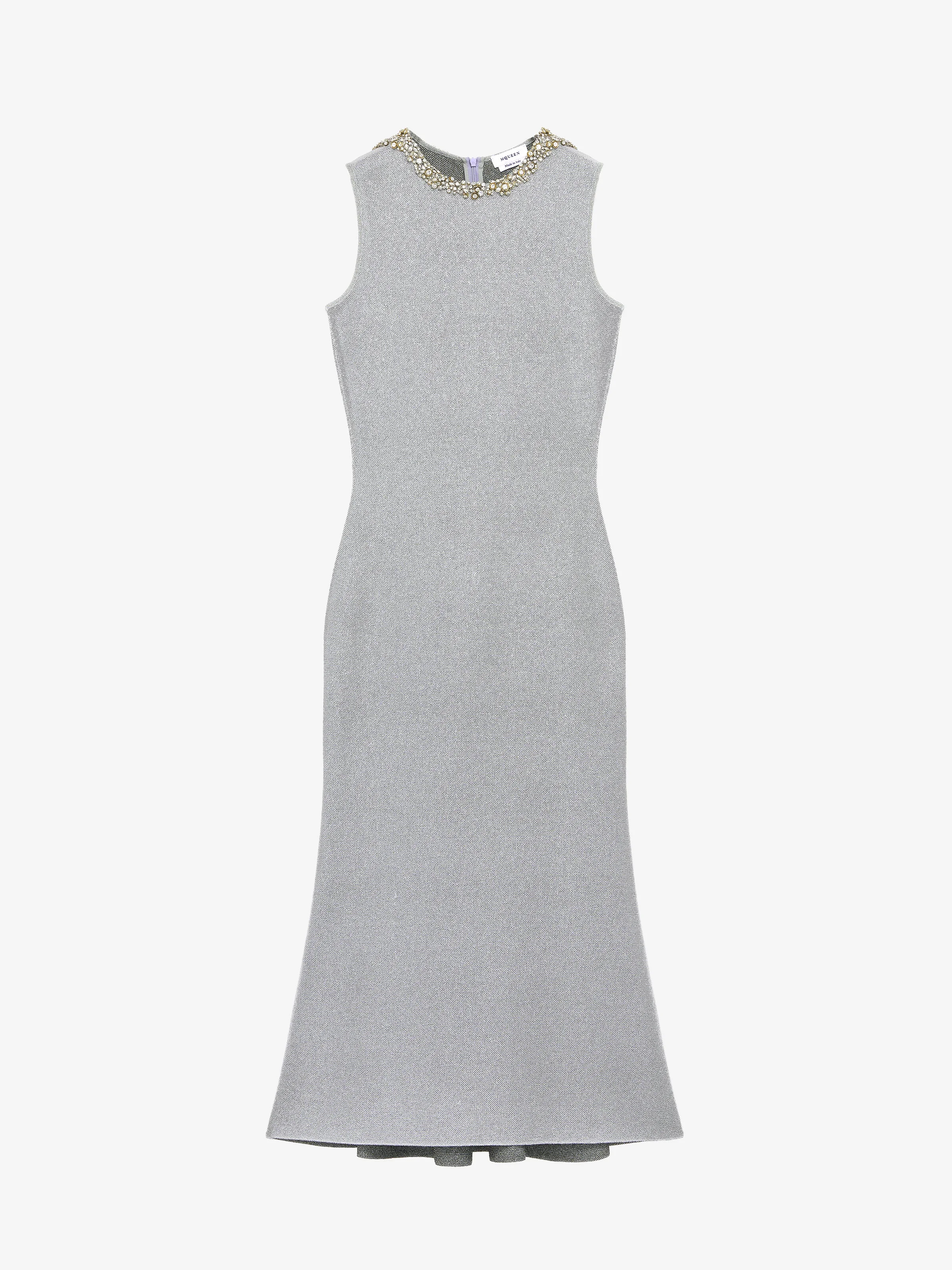 Sleeveless midi dress in silver metallic viscose knit. Crew neck with Chain Mail embroidery made of crystals, bugle beads and metal bullion. Finished with a back zip fastening. Product details - Crew neck - Sleeveless - Back zip fastening - Product code: 852536Q1BFT1395 - Made in ITALY - Material: 81% Viscose, 17% Metalic Polyester, 2% Polyester