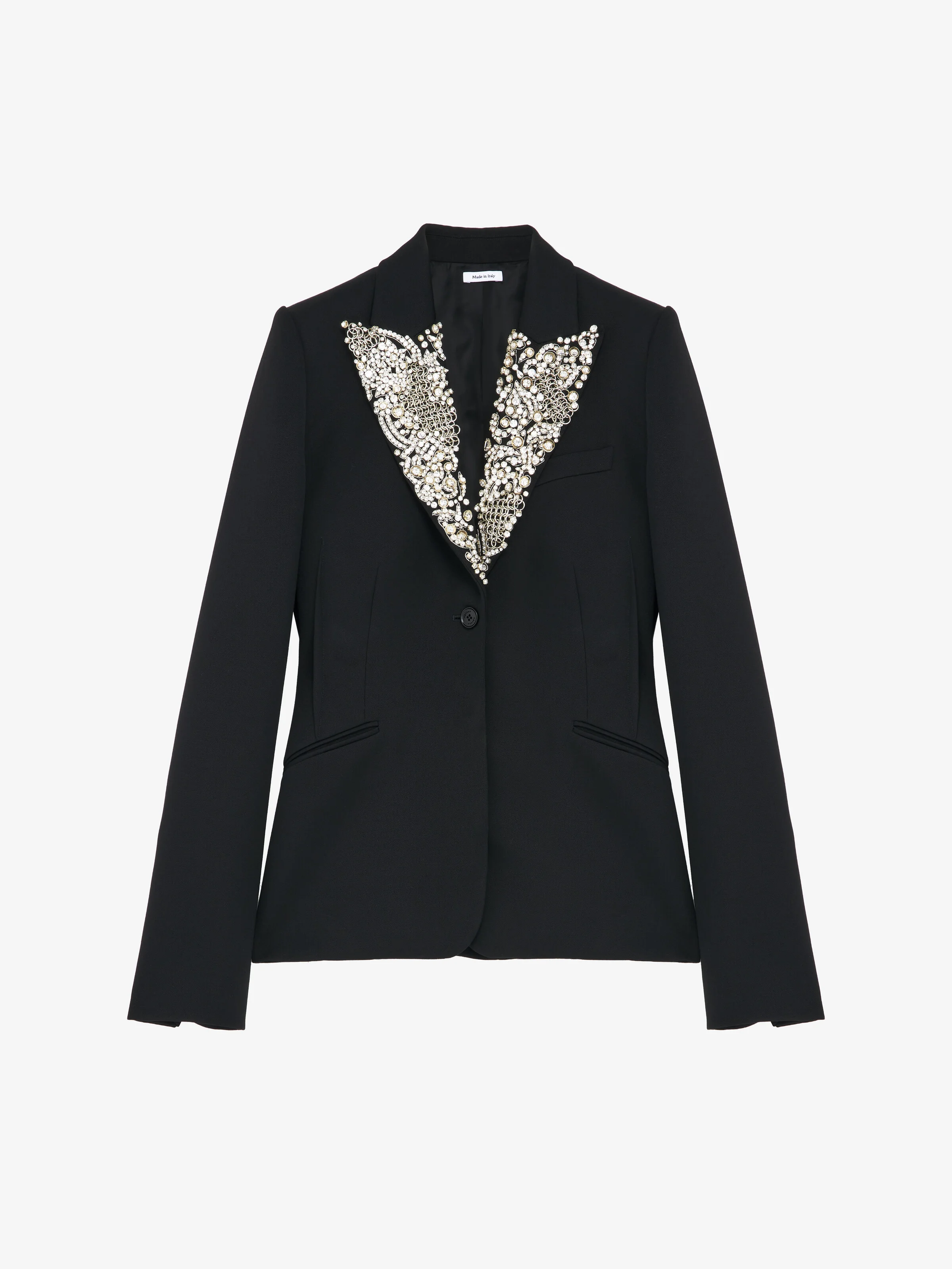 Single-breasted jacket in black grain de poudre. Peak lapels with Chain Mail embroidery made of crystals, bugle beads and metal bullion. Finished with dart detailing on the front and back. Product details - Peak lapels - Side jetted pockets - Single button fastening - Product code: 852197QJAAC1000 - Made in ITALY - Material: 100% Wool