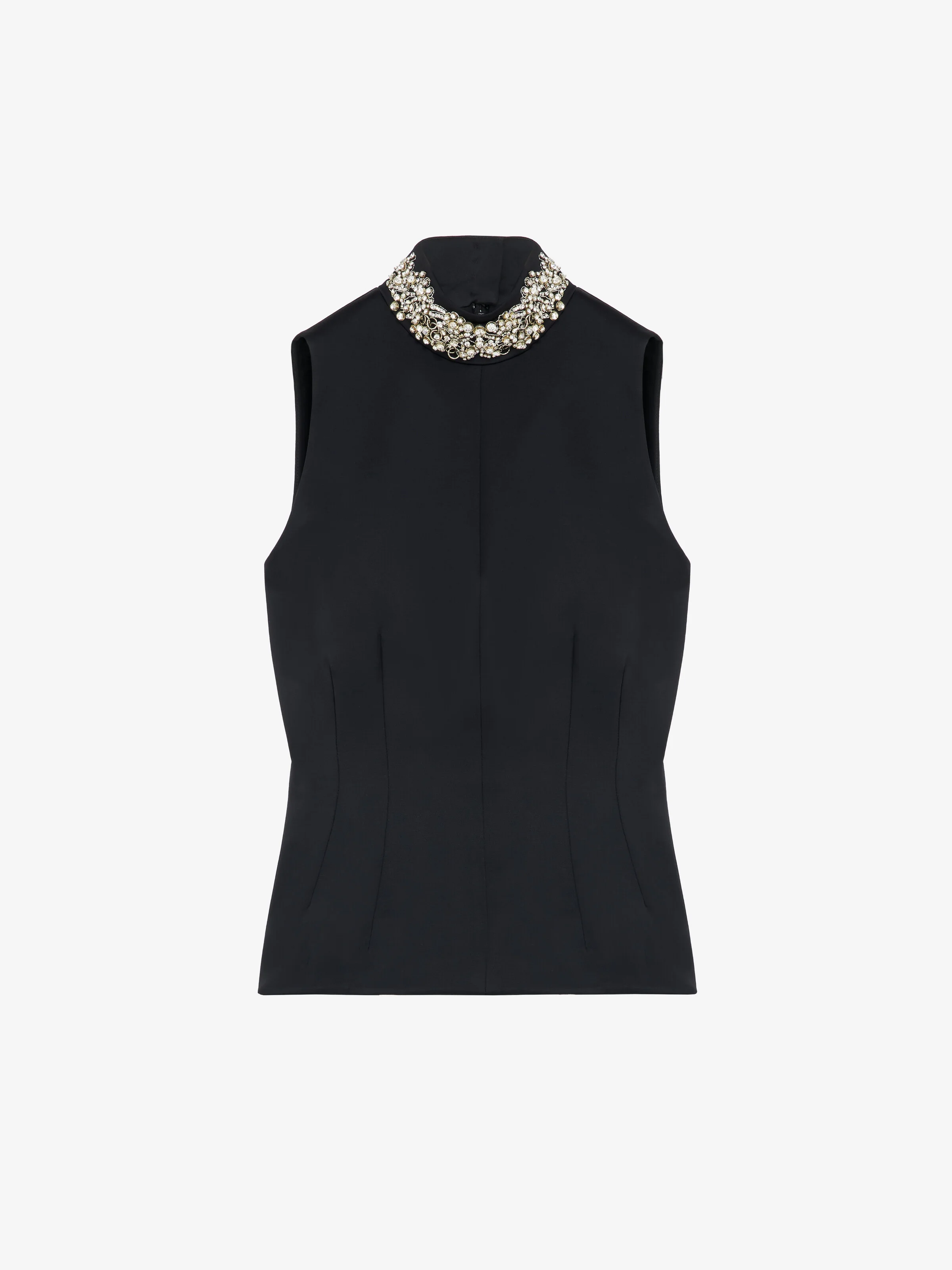 Sleeveless top in black wool viscose tailoring. High neck with Chain Mail embroidery made of crystals, bugle beads and metal bullion. Dart detailing on the front and back. Finished with a back button and zip fastening. Product details - High neck - Sleeveless - Back button and zip fastening - Product code: 854315QEAHJ1000 - Made in ITALY - Material: 73% Viscose, 24% Wool, 3% Elastane