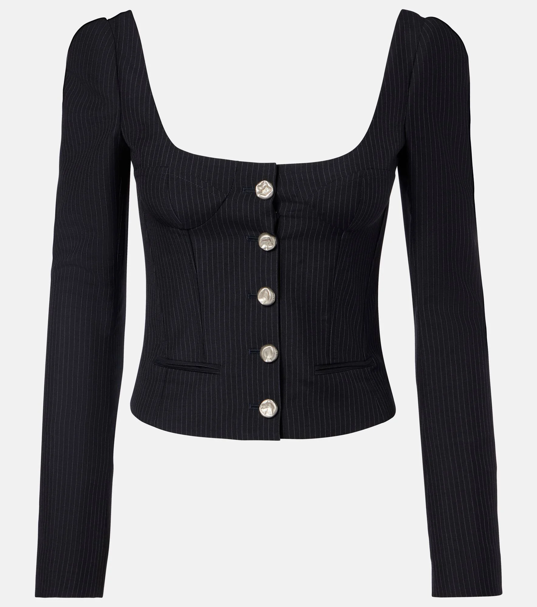 The house of McQueen continues to revisit traditional silhouettes through a new lens. Made from wool and mohair, this top showcases a refined chalk stripe motif, a flattering scoop neckline, and elegant pearl-hued buttons. Product Details - Material: 75% wool, 25% mohair - Care instructions: dry clean - Made in Italy - Color: blue - Designer color name: Navy - Closure: single-breasted - Cuff: four buttons - Padded cups - Boning - Pockets: welt pockets - Item number: P01142567 Size & Fit - True to size - Low back - Internal boned corset for support - Cinched waist - Non-stretchy fabric - Slightly cropped - The model seen in the picture is 178cm-5'10" and wearing a size IT 40