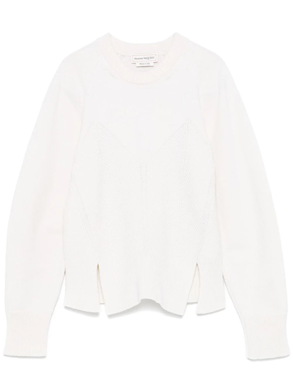 geometric-pattern sweater Highlights - Cream white - Wool-cashmere blend - Knitted construction - Geometric pattern - Crew neck - Extra-long raglan sleeves - Ribbed cuffs - Side slits - Unlined - Asymmetric hem Made in Italy Composition Wool 90%, Cashmere 10% SIZE & FIT Model measurements Height 5 ft 11 in(1.8 m) Bust/Chest 32.67 in(83 cm) Hips 35.82 in(91 cm) Waist 25.98 in(66 cm) FittingInformation Designed for a slim fit that sits just away from the body offering a close yet comfortable fit Made with a midweight knit, this piece offers some stretch