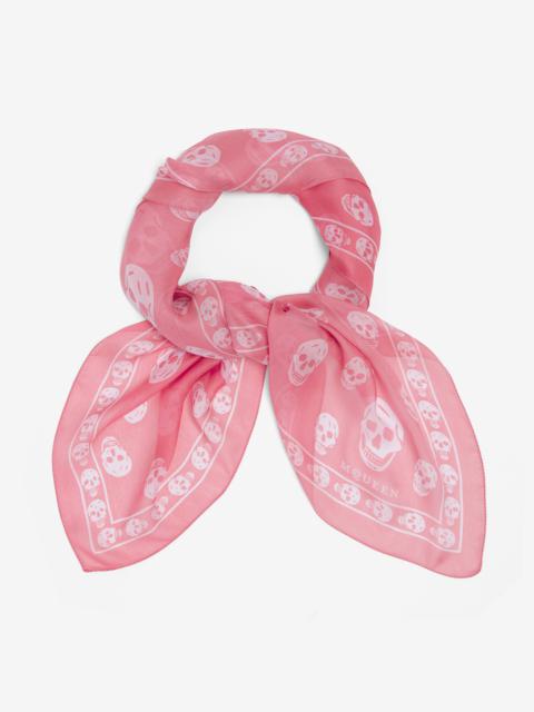 Powder pink and raspberry ladder silk chiffon foulard featuring an all-over skull motif. The foulard is finished with a skull border and the McQueen logo in the bottom right corner. Product details - Dimensions: 104 x 120cm / 40.9 x 47.2 inches - Product code: 8078893052Q5972 - Made in ITALY - Material: 100% Silk