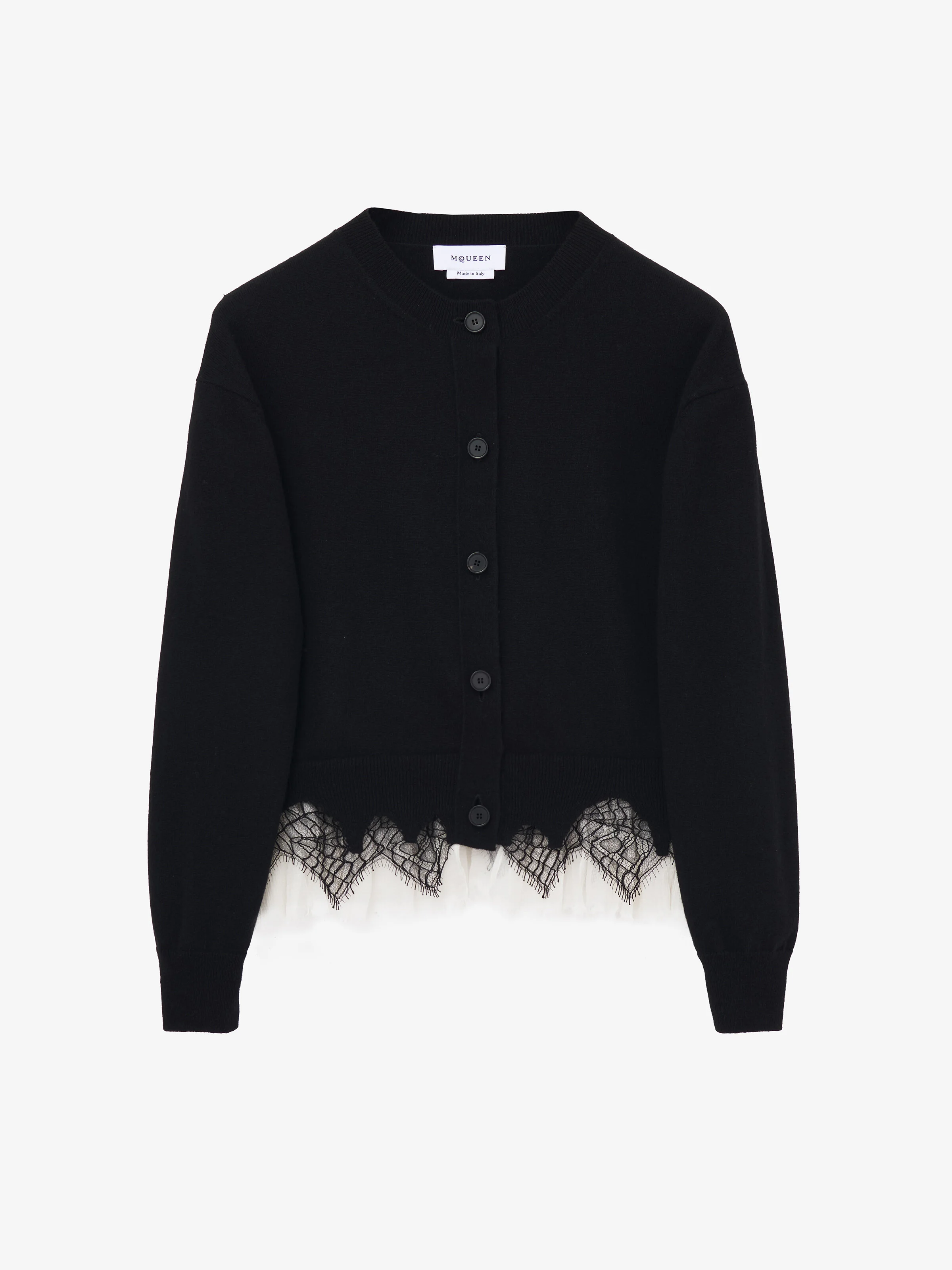 Crew neck shrunken cardigan in black wool cashmere. Long sleeves. Black cobweb lace and ivory silk plisse creponne trims at the hem. Finished with a front button fastening. Product details - Crew neck - Long sleeves - Front button fastening - Made with certified wool yarn - Product code: 829289Q1BC81080 - Made in Italy - Material: Wool, Cashmere