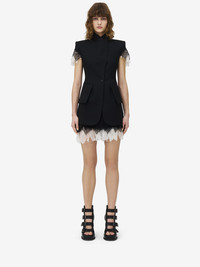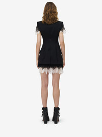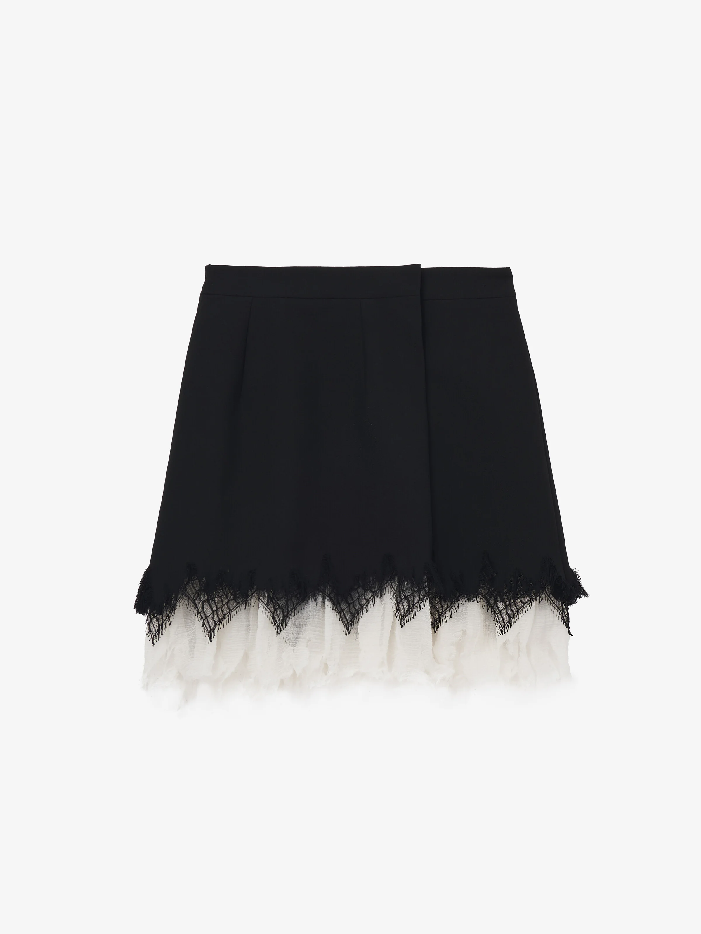 Mini skirt in black Japanese wool gabardine. Black cobweb lace and ivory silk plisse creponne trims at the hem. Finished with a concealed side fastening. Product details - High waist - Concealed side fastening - Made with certified wool yarn - Product code: 830083QJADK1000 - Made in Italy - Material: Wool
