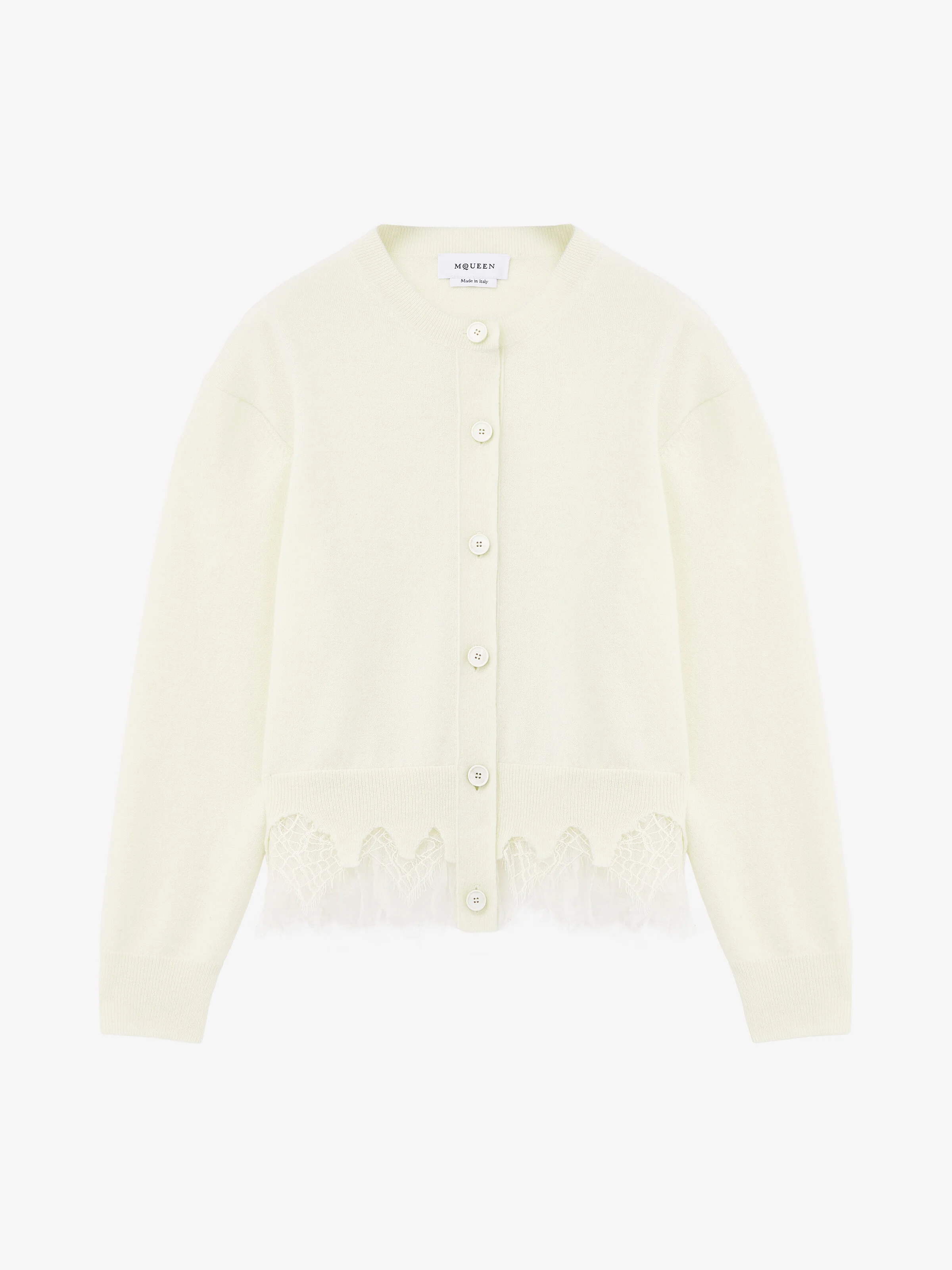 Crew neck shrunken cardigan in ivory wool cashmere. Long sleeves. Tonal cobweb lace and silk plisse creponne trims at the hem. Finished with a front button fastening. Product details - Crew neck - Long sleeves - Front button fastening - Product code: 829289Q1BC89288 - Made in Italy - Material: Wool, Cashmere