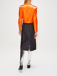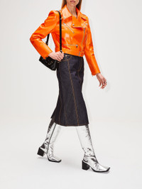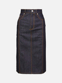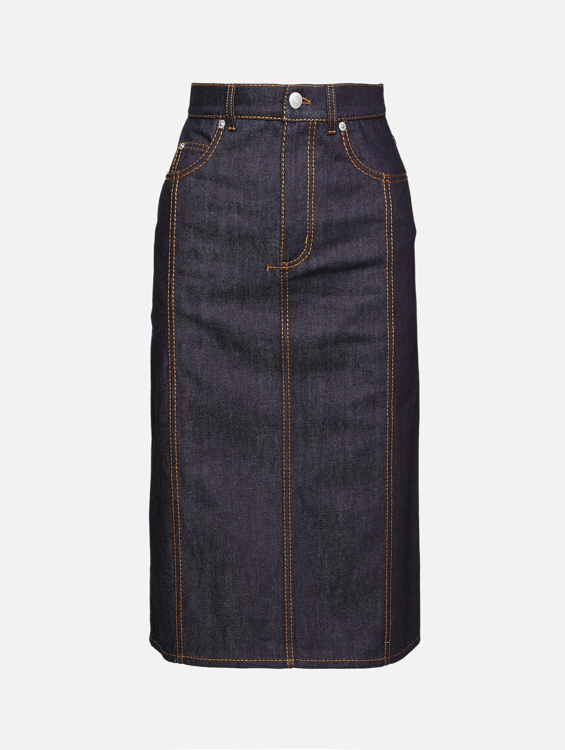 Cut in pure cotton, this denim midi skirt has a rich dark wash and five pockets accented by contrast topstitching. The column silhouette falls from a high waist and features a center-back slit for better movability. Note the back leather logo patch for that special designer touch. Designer Considered to be one of the most influential and innovative designers in fashion history, Alexander McQueen's extraordinary heritage is defined by emotional power and raw energy, as well as a profound respect for craftsmanship. Details - 100% cotton - High waist - Belt loops - Zip fly and button closure - Back leather logo patch - Five pockets - Straight silhouette - Contrast topstitching - Center-back slit - Midi length - True to size - Made in Italy - Dry clean only - Item # 1-158221