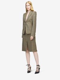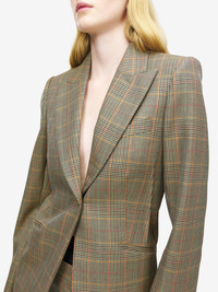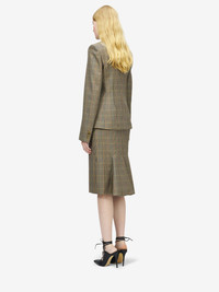 Single-breasted jacket featuring a multicoloured Country Check pattern. Peak lapels, chest pocket and two jetted pockets on the sides. Finished with a T-Bar chain back detail. Complete the look with the matching skirt. Product details - Peak lapels - Side flap pockets - Single button fastening - Product code: 861790QJAFR9101 - Made in ITALY - Material: 100% Wool