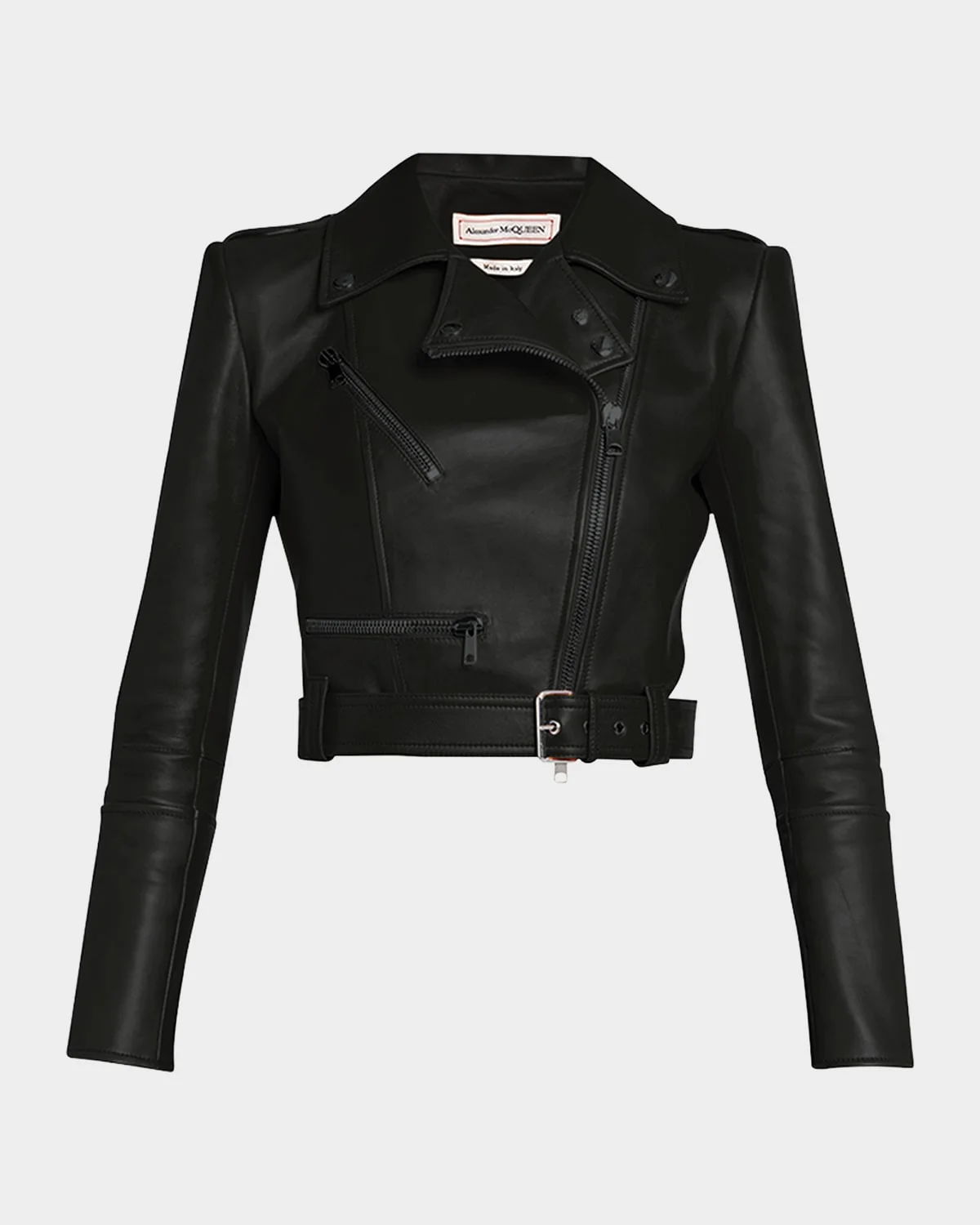 McQueen cropped biker jacket in lambskin leather Notched collar Asymmetric zip front Long sleeves; zipper vents Front zip pockets Belted waist Fitted silhouette Lambskin leather Lining: Viscose Made in Italy