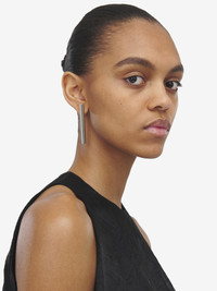Palladium-finished statement T-Bar earrings featuring an engraved McQueen logo. Eco brass hardware. Suitable for pierced ears. Product details - Dimensions: 57mm 5.7cm / 2.24 inches - Eco brass hardware - Palladium finish - Suitable for pierced ears - Push-back closure - For hygiene reasons, we do not accept returns or exchanges on all pierced earrings. - Product code: 804616J160N0926 - Made in Italy - Material: Brass