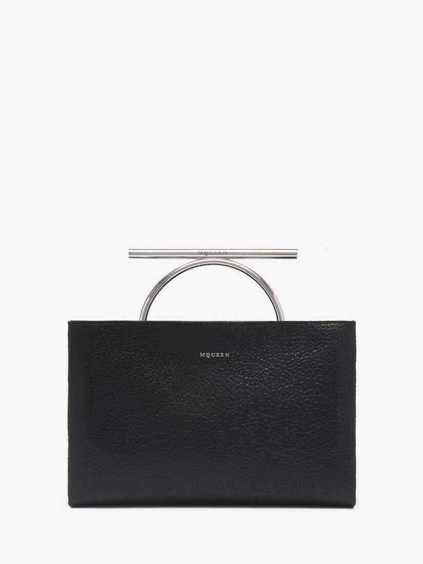 The McQueen T-Bar clutch – black textured lamb leather. Detailed with silver tone metal logo. Completed with two asymmetrical zipped compartments. Carried handheld using signature oversized T-Bar metal handle in shiny gold tone metal engraved with the McQueen logo. Product details - Dimensions: Length 30 x Height 20 x Depth 3 cm / 11.8 x 7.8 x 1.1 inches - T-Bar length: 17 cm / 6.6 inches - McQueen metal lettering - Double zip fastening - Silver-finished hardware - Two compartments - Internal card slot with metal D-ring - Nappa leather lining - Product code: 8035321VDBE1000 - Made in Italy - Material: Lambskin