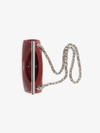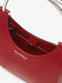 The McQueen Mini T-Bar bag – red lamb leather. The structured body features pleated sides. Detailed with a statement circular T-Bar handle in silver tone metal engraved with the McQueen logo. Can be carried handheld or worn crossbody using the detachable silver tone metal chain strap. Product details - Dimensions: Length 20 x Height 17.5 x Depth 6 cm / 7.8 x 6.8 x 2.3 inches - T-Bar length: 17 cm / 6.6 inches - Detachable chain strap - Strap drop: 55 cm / 21 inches - McQueen metal lettering - Magnet fastening - Silver-finished hardware - One central compartment - Internal card slot with metal D-ring - Nappa leather lining - Product code: 8035251VDBB6820 - Made in Italy - Material: Lambskin