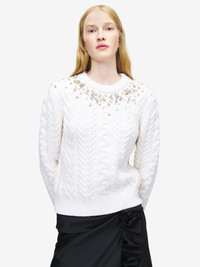 Cable knit jumper in ivory wool cashmere. Crew neck with crystal embroidery. Product details - Crew neck - Long sleeves - Product code: 852190Q1BFR9006 - Made in ITALY - Material: 90% Wool, 10% Cashmere