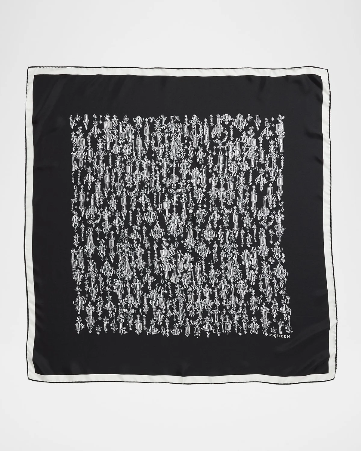 McQueen silk neck scarf showcases an elegant crystal motif Logo signature on the corner Contrast border May be styled multiple ways Silk Dry clean Made in Italy