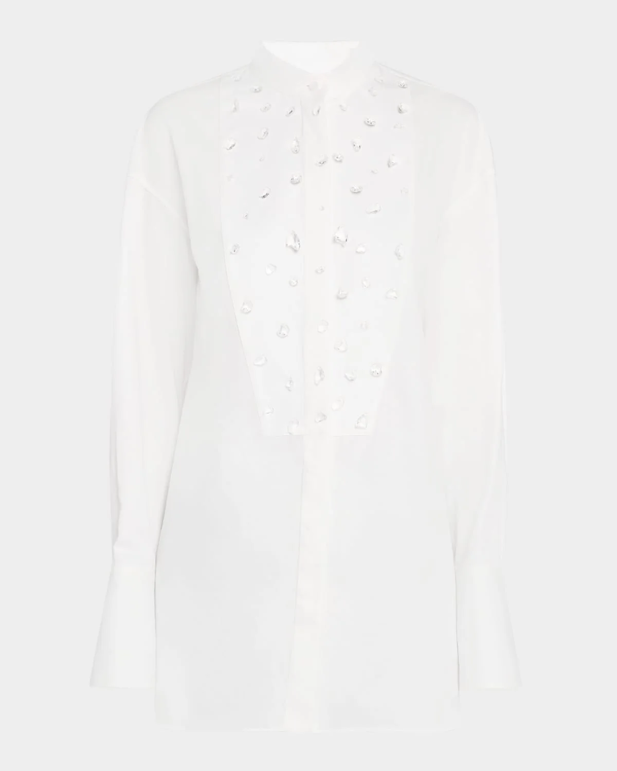 McQueen tuxedo blouse featuring a crystal embroidered bib front Band collar; concealed button front Long sleeves; button cuffs Loose fit Vented hem Cotton Dry clean Made in Italy