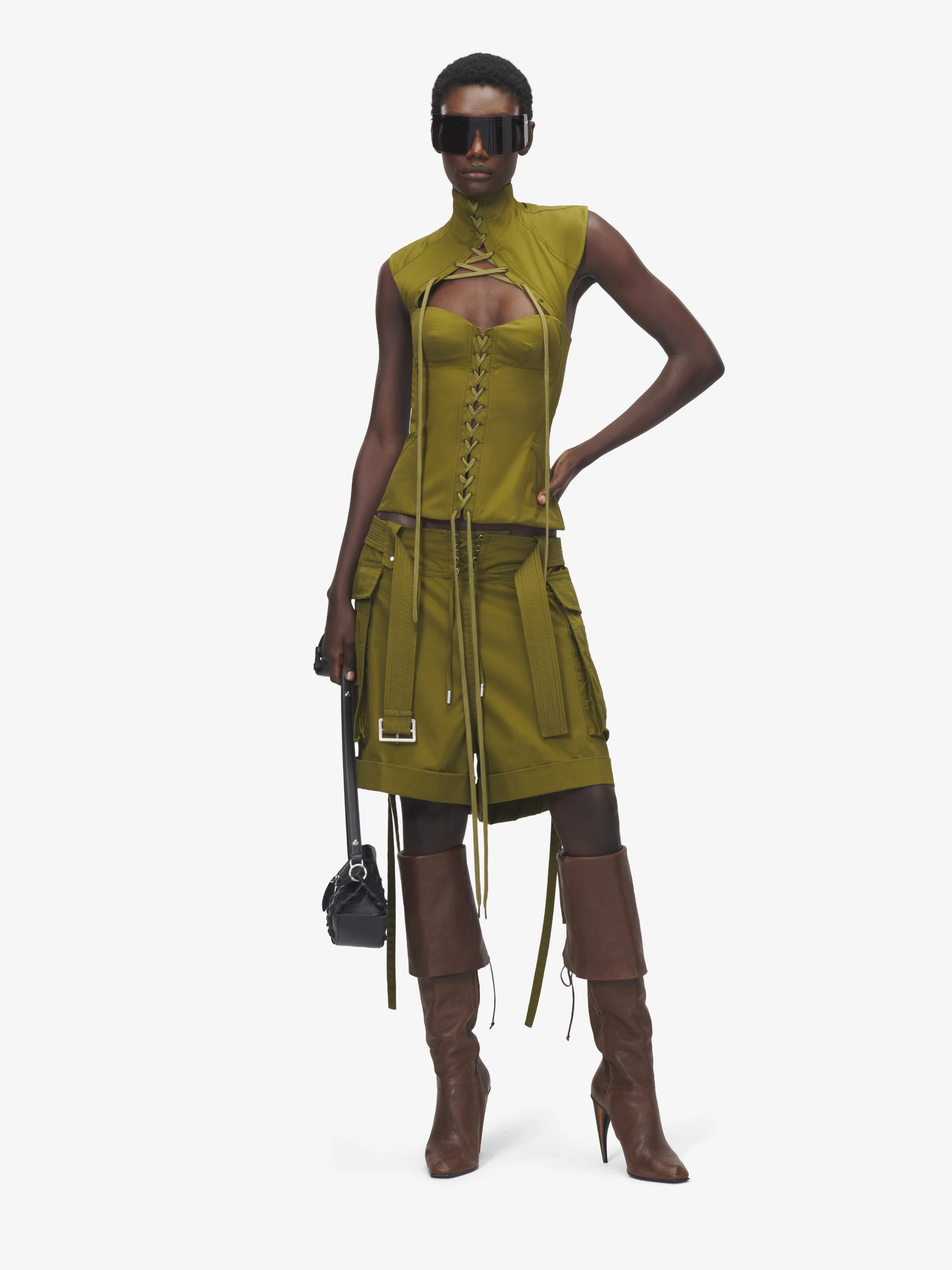 Corset-inspired fitted top in olive washed cotton gabardine. High neck, cap sleeves, and front cut out with lace-up detailing. Finished with a back zip fastening. Product details - High neck - Cap sleeves - Back zip fastening - Product code: 868864QFABV3004 - Made in ITALY - Material: 100% Cotton