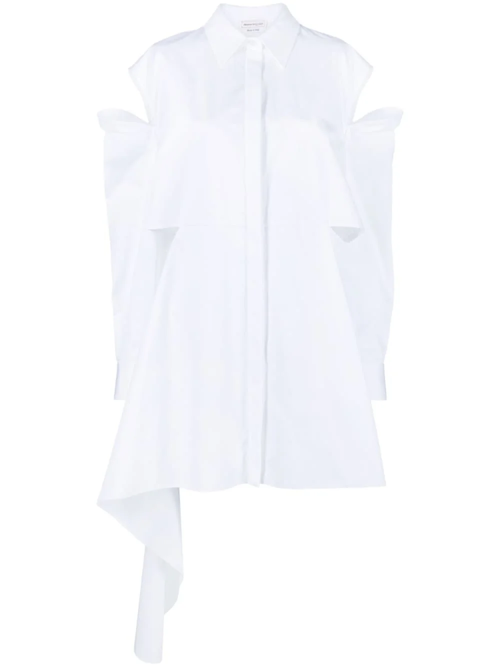 cut-out detail shirt dress Alexander McQueen's impeccable use of tailoring is paired with signature gothic influences on this long-sleeve dress. Constructed like a classic shirt, the garment features cut-out detailing at the sleeves, creating an edgy design. Highlights - White - Cotton - Classic collar - Long sleeves - Cut-out detailing - Front button fastening Made in Italy Composition Lining: Cotton 100% Outer: Cotton 100% SIZE & FIT Model measurements Height 5 ft 11 in(1.8 m) Bust/Chest 32.67 in(83 cm) Hips 36.22 in(92 cm) Waist 24.4 in(62 cm) FittingInformation Designed to be fitted across the shoulders, becoming looser as it falls Made from a midweight non-stretch fabric This piece fits true to size – take your usual size