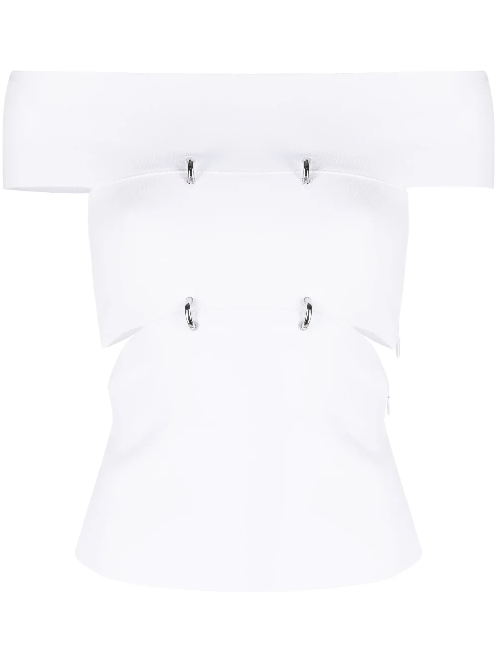 cut-out off-shoulder top Known for its creative designs with punk-rock inspiration, Alexander McQueen presents this top for his SS23 collection. With a straight off-the-shoulder silhouette, this piece is adorned cut-out detailing and ring embellishments that seem to connect the parts of the garment. Highlights - Optical white - Stretch-design - Off-shoulder - Cut-out detailing - Ring embellishment - Silver-tone hardware - Concealed side zip fastening Made in Italy Composition Viscose 79%, Polyester 15%, Polyamide 5%, Elastane 1% SIZE & FIT Model measurements Height 5 ft 10 in(1.77 m) Bust/Chest 32.67 in(83 cm) Hips 35.43 in(90 cm) Waist 23.62 in(60 cm) FittingInformation Designed for a close fit throughout Made with a midweight knit, this piece offers some stretch This piece fits true to size – take your usual size Washing instructions Dry Clean Only
