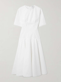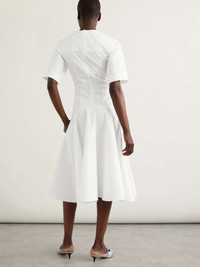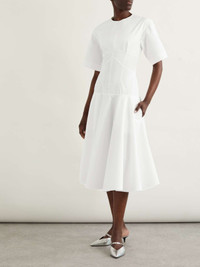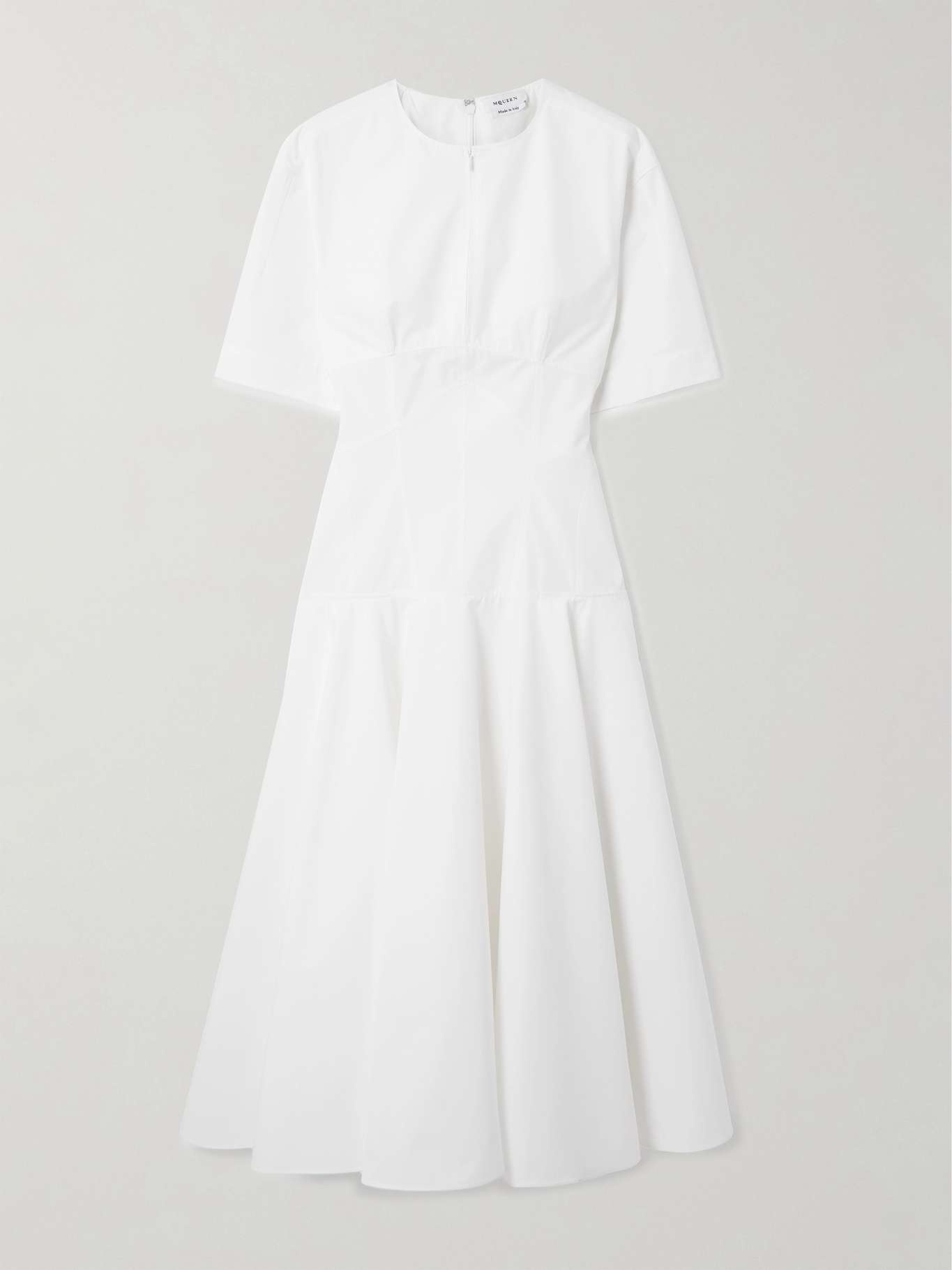 EDITORS'NOTES There's a level of precision behind Alexander McQueen's collections, ensuring every style fits just so. This midi dress is cut from crisp organic cotton-poplin and has a corset-inspired waist defined by raised seams. The floaty skirt balances the proportions and adds beautiful movement. SIZE & FIT Model measurements: - Fits true to size, take your normal size - Designed to be slightly fitted at the bust and waist, loose at the hip - Lightweight, non-stretchy fabric - Model is 177cm/ 5'10" and is wearing an IT 38 - Bust: 81cm/ 32" - Waist: 62cm/ 24.5" - Hip: 89cm/ 35" DETAILS & CARE - White organic cotton-poplin - Concealed zip fastening along front and back - 100% organic cotton