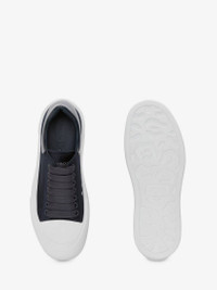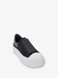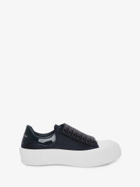 Anthracite satin lace-up Deck Plimsoll with patent heel counter and thick oversized rubber sole. The lace-up is detailed with a rubber wrap sole and tonal Alexander McQueen signature. Round toe shape silhouette details rubber toe cap. Comes with an additional set of shoelaces. Material:67% Viscose, 33% Silk Product Code:708085W4GP91103