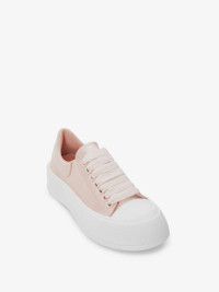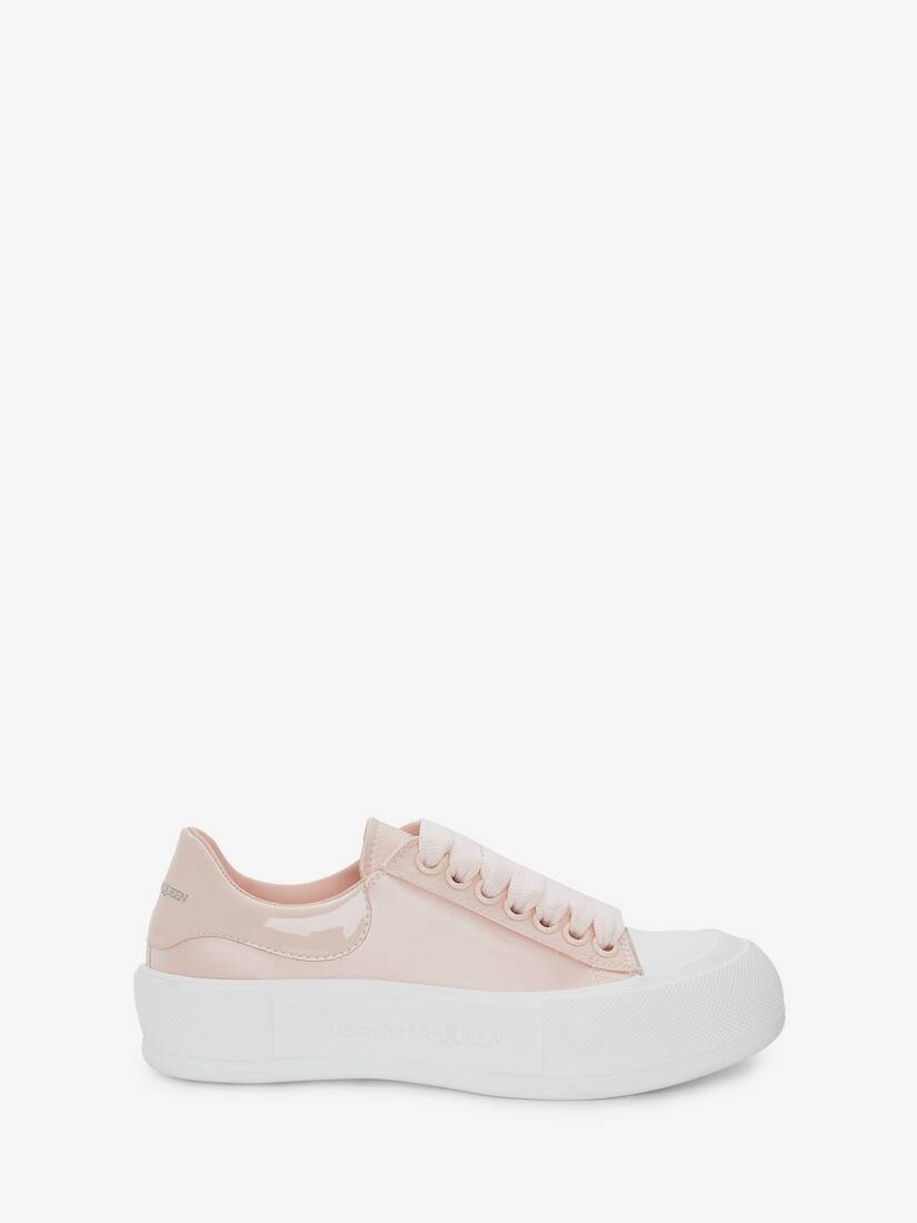 Tea rose satin lace-up Deck Plimsoll with patent heel counter and a thick oversized rubber sole. The lace-up is detailed with a rubber wrap sole and tonal Alexander McQueen signature. Round toe shape silhouette details rubber toe cap. Comes with an additional set of shoelaces. Material:68% Viscose, 32% Silk Product Code:708085W4SBB5969