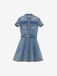 Mini dress in light blue denim. Standing collar, epaulettes, and short sleeves with cuff detailing. Finished with a gold-tone button fastening and a T-Bar buckle waist belt. Product details - Standing collar - Chest pockets - Button fastening - Product code: 857116QMAD14383 - Made in ITALY - Material: 100% Cotton