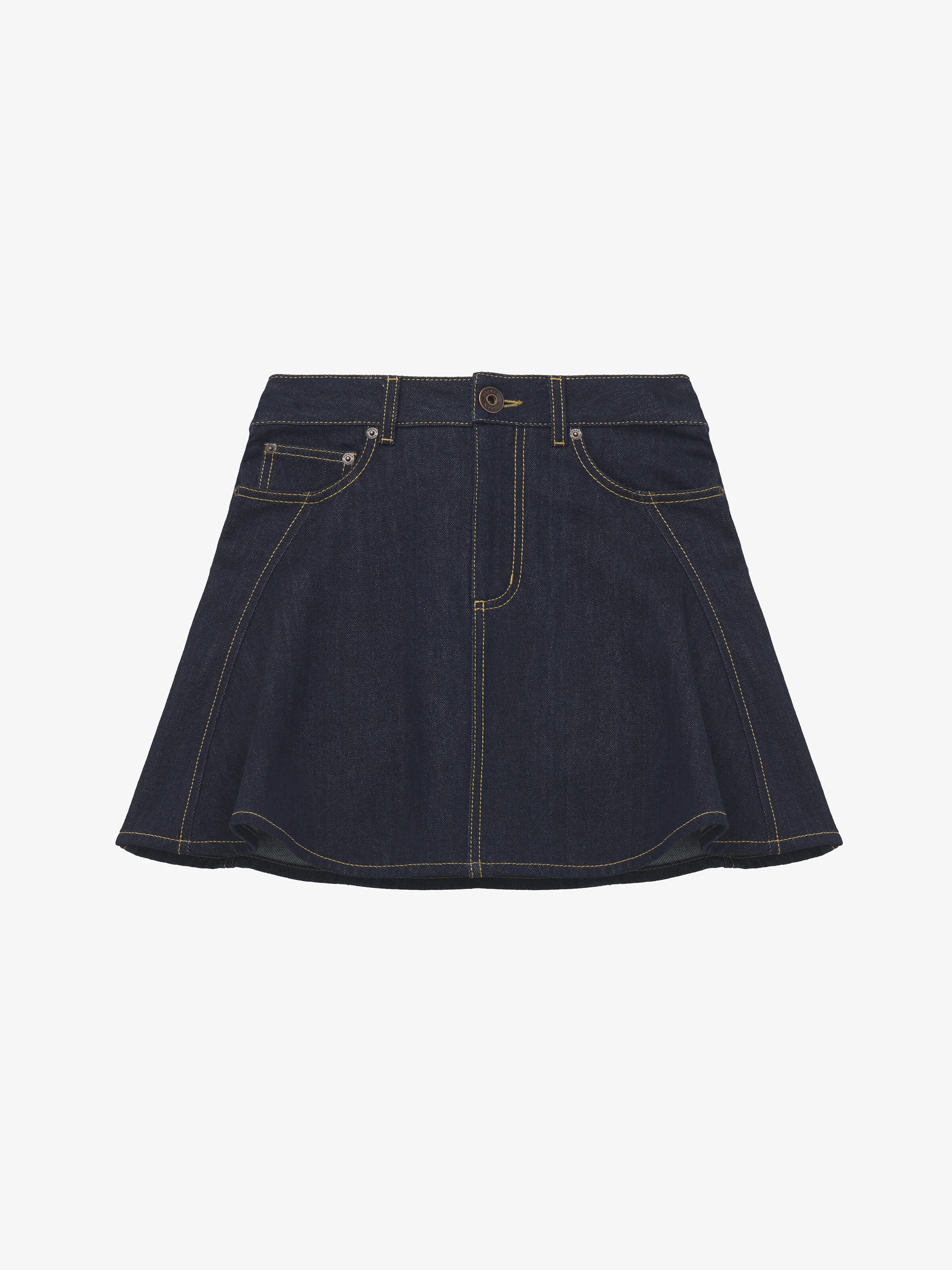 Flared mini skirt in dark blue denim. Five pocket design with contrast topstitching. Finished with a front button and zip fastening. Product details - Belt loops - Front button and zip fastening - Product code: 847959QMADZ4098 - Made in ITALY - Material: 100% Cotton