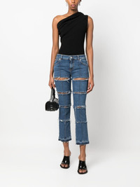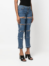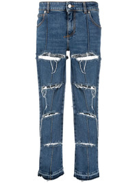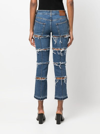 distressed cropped jeans Highlights - Navy blue - Stretch-cotton - Denim - Distressed effect - Ripped detailing - Low-rise - Belt loops - Concealed fly and button fastening - Classic five pockets - Logo patch to the rear - Cropped leg Made in Italy Composition Outer: Calf Leather 100%, Cotton 98%, Elastane 2% Lining: Polyester 65%, Cotton 35% SIZE & FIT Model measurements Height 5 ft 11 in(1.8 m) Bust/Chest 31.88 in(81 cm) Hips 35.03 in(89 cm) Waist 24.01 in(61 cm) Washing instructions Dry Clean Only