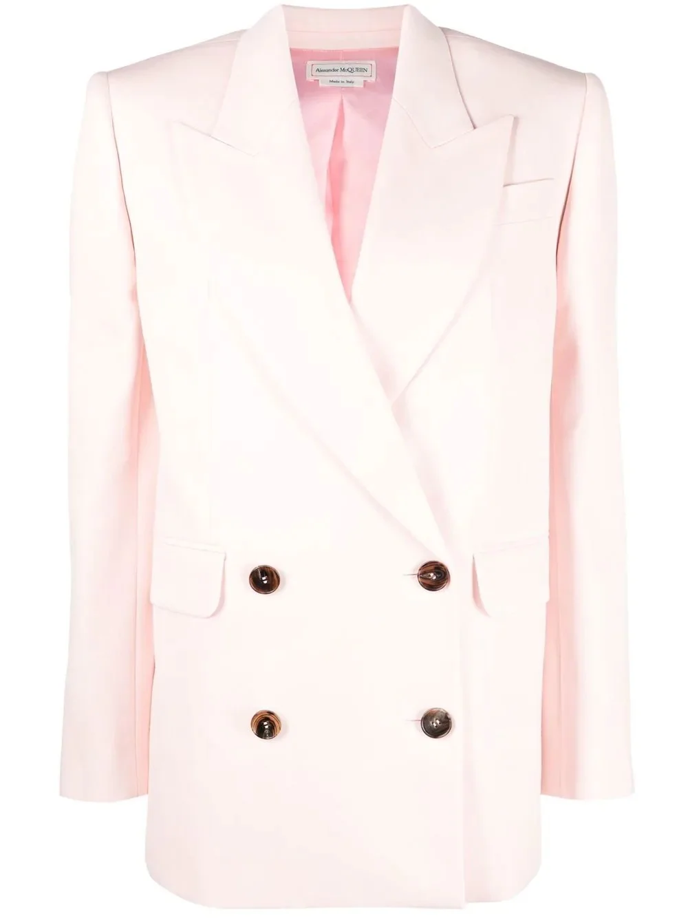 double-breasted boxy blazer Made from wool, this light pink blazer from Alexander McQueen has a classic silhouette with peak lapels and a double-breasted front. This tailored design offers a timeless shape in an unexpected colourway. Made in Italy Composition Outer: Wool 100% Lining: Cupro 100% SIZE & FIT Model measurements Height 5 ft 11 in(1.8 m) Bust/Chest 31.49 in(80 cm) Hips 36.61 in(93 cm) Waist 24.4 in(62 cm) FittingInformation This piece fits true to size. We recommend you get your regular size Cut for a loose fit Made with a mid-weight non-stretch fabric Washing instructions Dry Clean Only