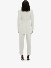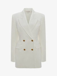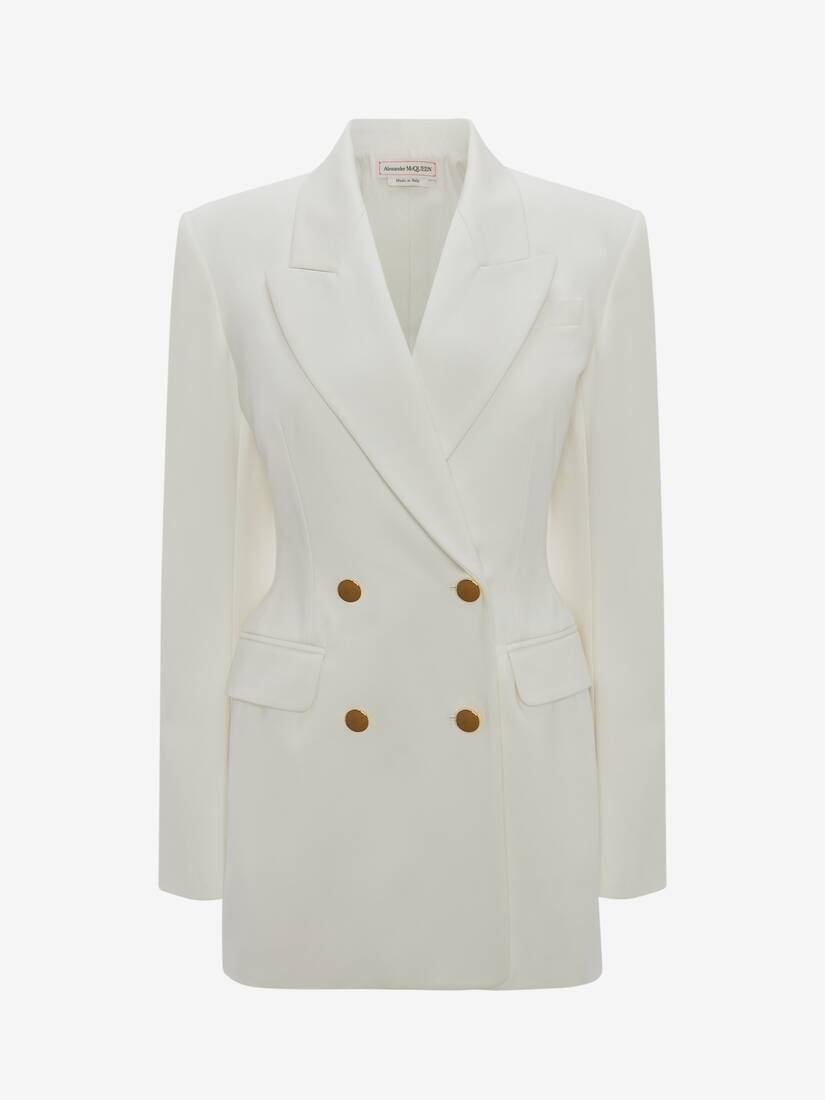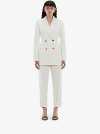 Double-breasted jacket in optical white cotton gabardine detailed with gold-finished buttons. Finished with flap pockets and peak lapels. Material: 100% Cotton