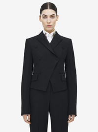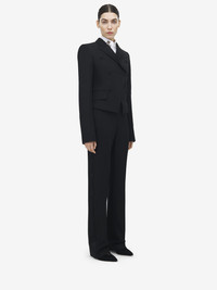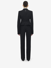 Tailored jacket in black wool tailoring. Peak lapels, chest pocket and two flap pockets on the sides. Finished with a T-bar chain back detail. Product details - Peak shoulders - Side flap pockets - Button fastening - Contains certified wool yarn - Product code: 839228QJAFH1000 - Made in Italy - Material: 72% Wool, 28% Viscose
