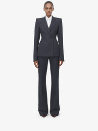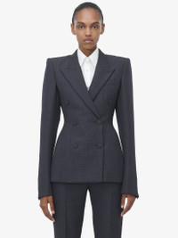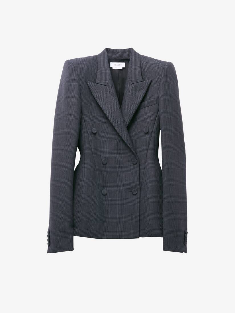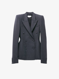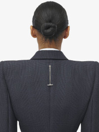Double-breasted jacket in black and dark grey Prince of Wales wool mohair. Peak lapels and slit pocket on the chest. Finished with a T-Bar chain back detail. Complete the look with the matching trousers. Product details - Peak lapels - Slit pocket on the chest - Button fastening - Contains certified wool yarn - Product code: 818861QJAEO1135 - Made in Italy - Material: Wool , Mohair