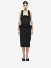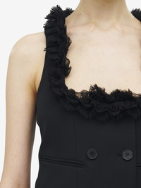 Double-breasted waistcoat in black grain de poudre. Scoop neck with gathered chiffon and creponne detailing and two front jetted pockets. Back in tonal satin with tie detailing. Product details - Scoop neck - Front jetted pockets - Button fastening - Made with certified wool yarn - Product code: 839558QJAAC1000 - Made in ITALY - Material: 100% Wool