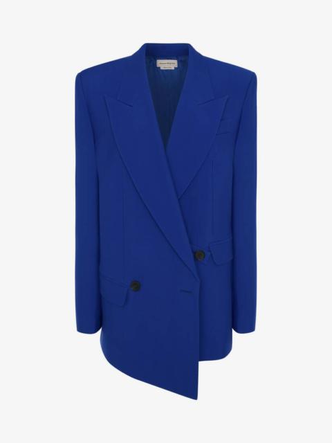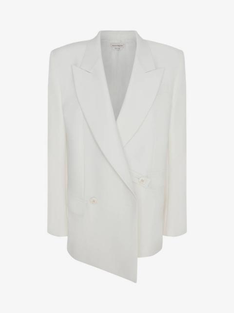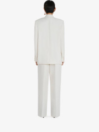 Double-breasted jacket in ivory wool with a drop hem and a boxy fit. The style features wide peak lapels and flap pockets. Finished with a button tab fastening. Material:100% Wool Product Code:703519QJACX9004