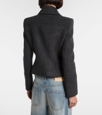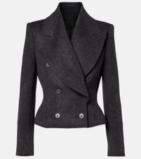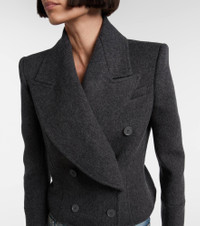 McQueen is celebrated for its uncompromising expression of individuality, subversive strength, and true power. Italian-crafted from pure wool, this lightly cropped jacket features a double-breasted front and exaggerated lapels. Product Details - Material: 100% wool - Care instructions: dry clean - Made in Italy - Designer color name: 1021 - Item color: gray - Lining: 100% cupro - Shoulder pads - Peak lapel - Closure: double-breasted - Pockets: angled chest pocket - Item number: P01121954 Size & Fit - True to size - Shoulder pad inserts - Cinched waist - Non-stretchy fabric - Slightly cropped - The model seen in the picture is 178cm-5'10" and wearing a size IT 40