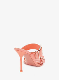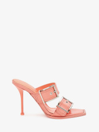 Apricot leather mule featuring silver finish buckles and a square toe silhouette. Finished with a padded leather insole and an Alexander McQueen signature and a lacquered stiletto heel. Product Details: - Heel height: 90mm Material:100% Calf leather Product Code:709990WHSWD7876