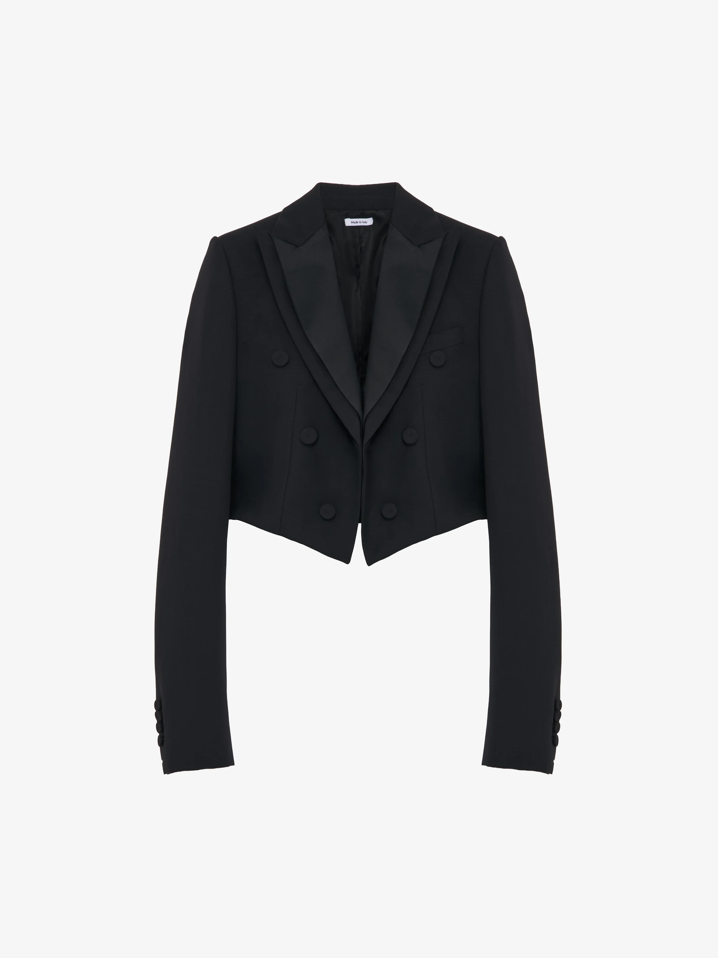 Cropped jacket in black grain de poudre. Double peak lapels, chest pocket, decorative self-covered buttons and concealed hook fastening. Finished with a T-Bar chain back detail. Product details - Peak lapels - Chest pocket - Concealed hook fastening - Covered button closure - This product contains 39% of certified wool and 61% of wool sourced from producers following regenerative practices, Kering is partnering among others with the Savory Institute to promote and support the regenerative production of raw materials and utilize Savory's institute methodology (Ecological Outcome Verification) - Product code: 847012QJAAC1000 - Made in ITALY - Material: 100% Wool