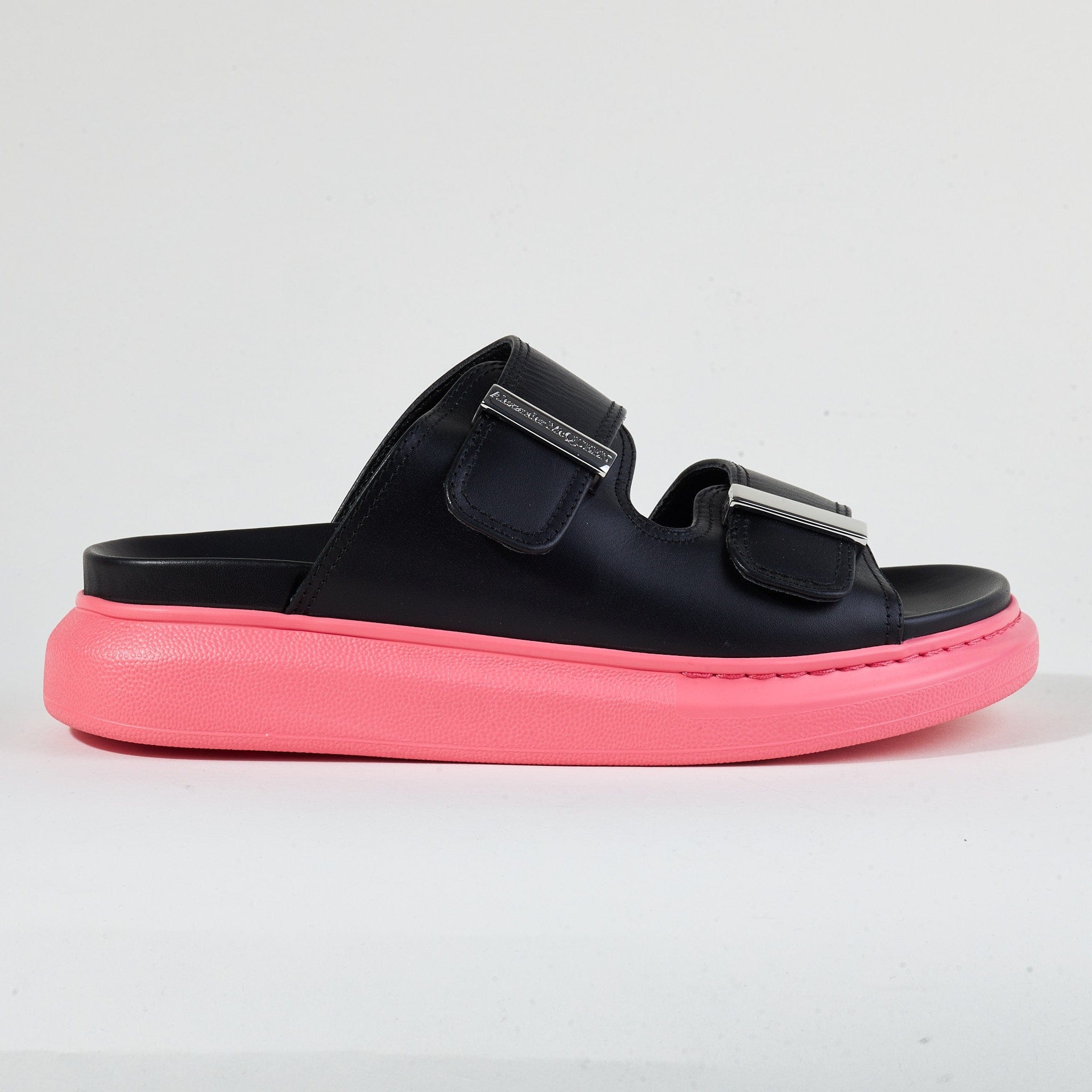 - Black/Coral Pink - Calf Leather - Oversized Sole - Round Toe Silhouette - Bar Slide Fastening - Soft - Alexander McQueen Branding Relaxing just got luxurious with Alexander McQueen Women’s Hybrid Slides. The super soft calf leather slides come in basic black, and the oversized sole provides comfort to your feet. A classic round-toe silhouette and bar slide fastening make a fetching design to show off your latest pedicure. Signature Alexander McQueen branding is seen throughout.