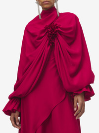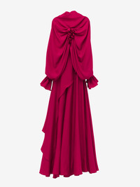 Layered evening dress in crimson washed silk habutai. Crew neck with back bow, front cape design with fluid draping, ruffle detailing on the chest and cuffs. Product details - Crew neck - Long sleeves - Back bow - Product code: 844134QBABE6191 - Made in ITALY - Material: 100% Silk