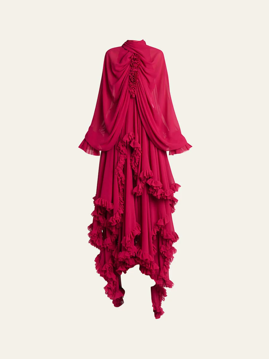 Draped Open-Back Ruffle Cape Gown